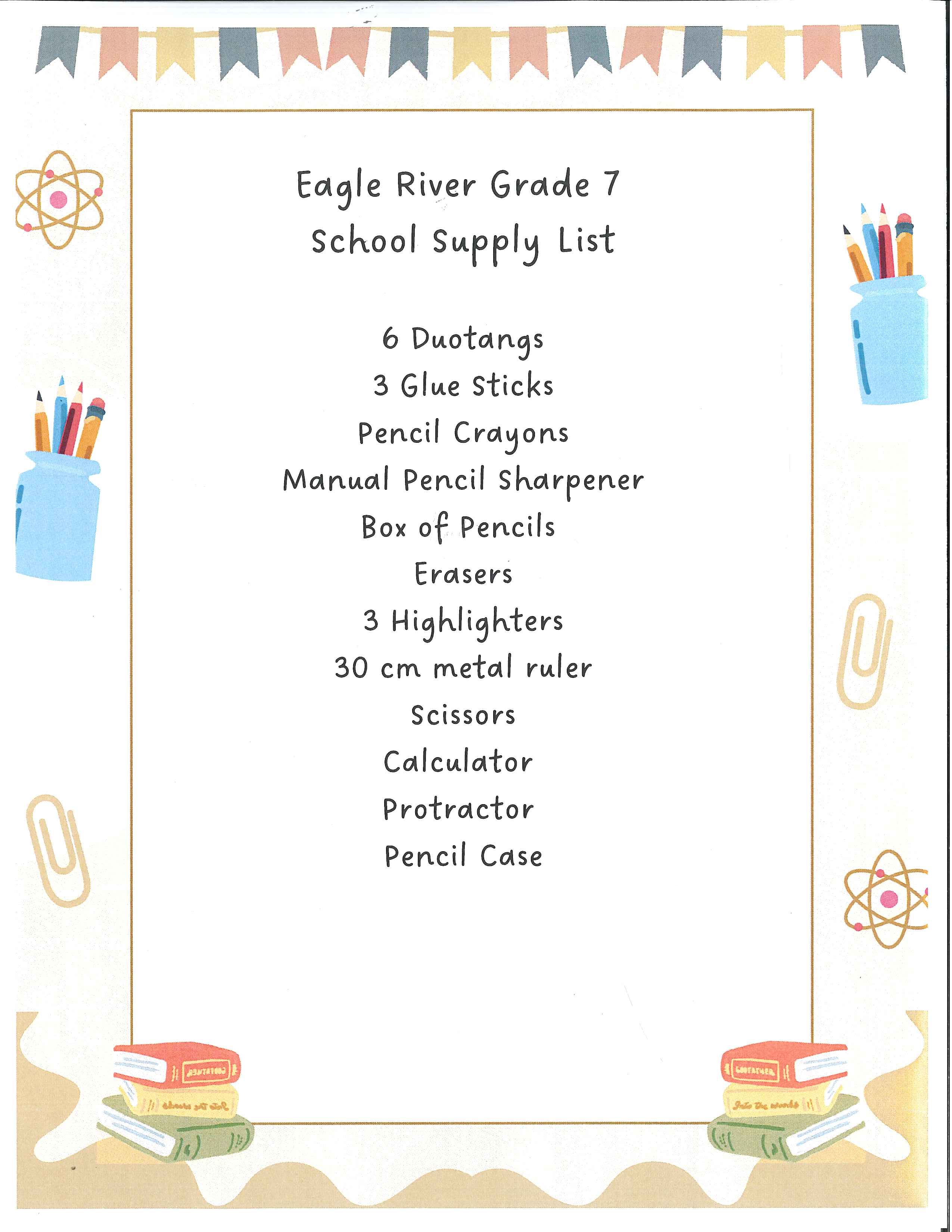 Here is the suggested supply list for students entering Grade 7 in September. Enjoy the rest of your summer!
